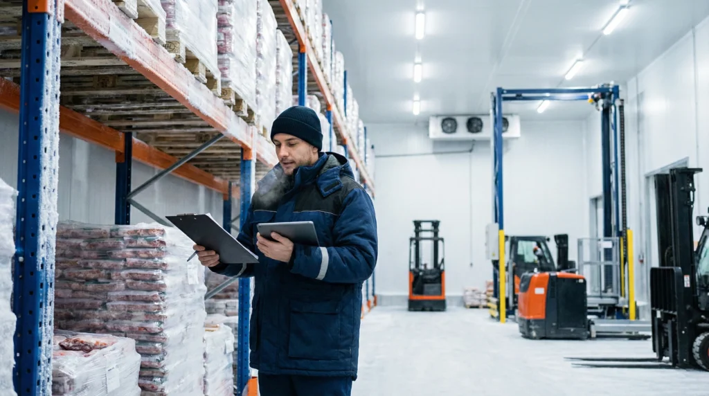 Worker with clipboard managing inventory in cold storage warehouse facility